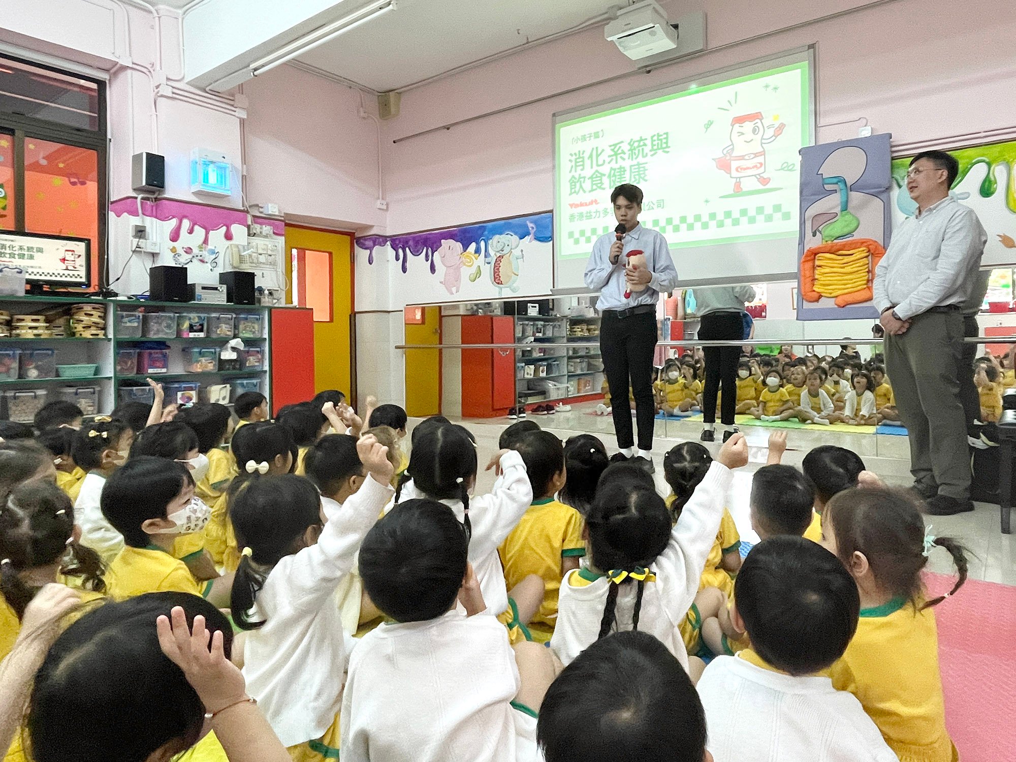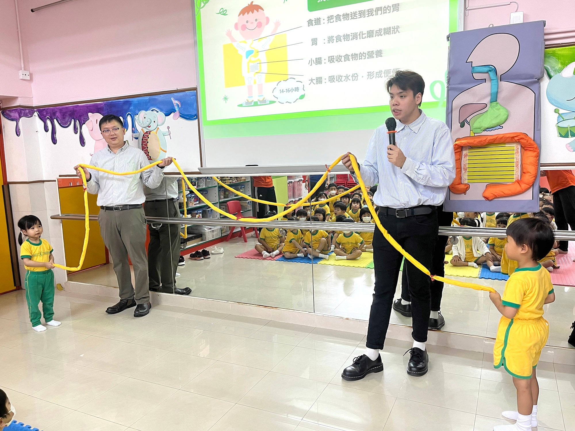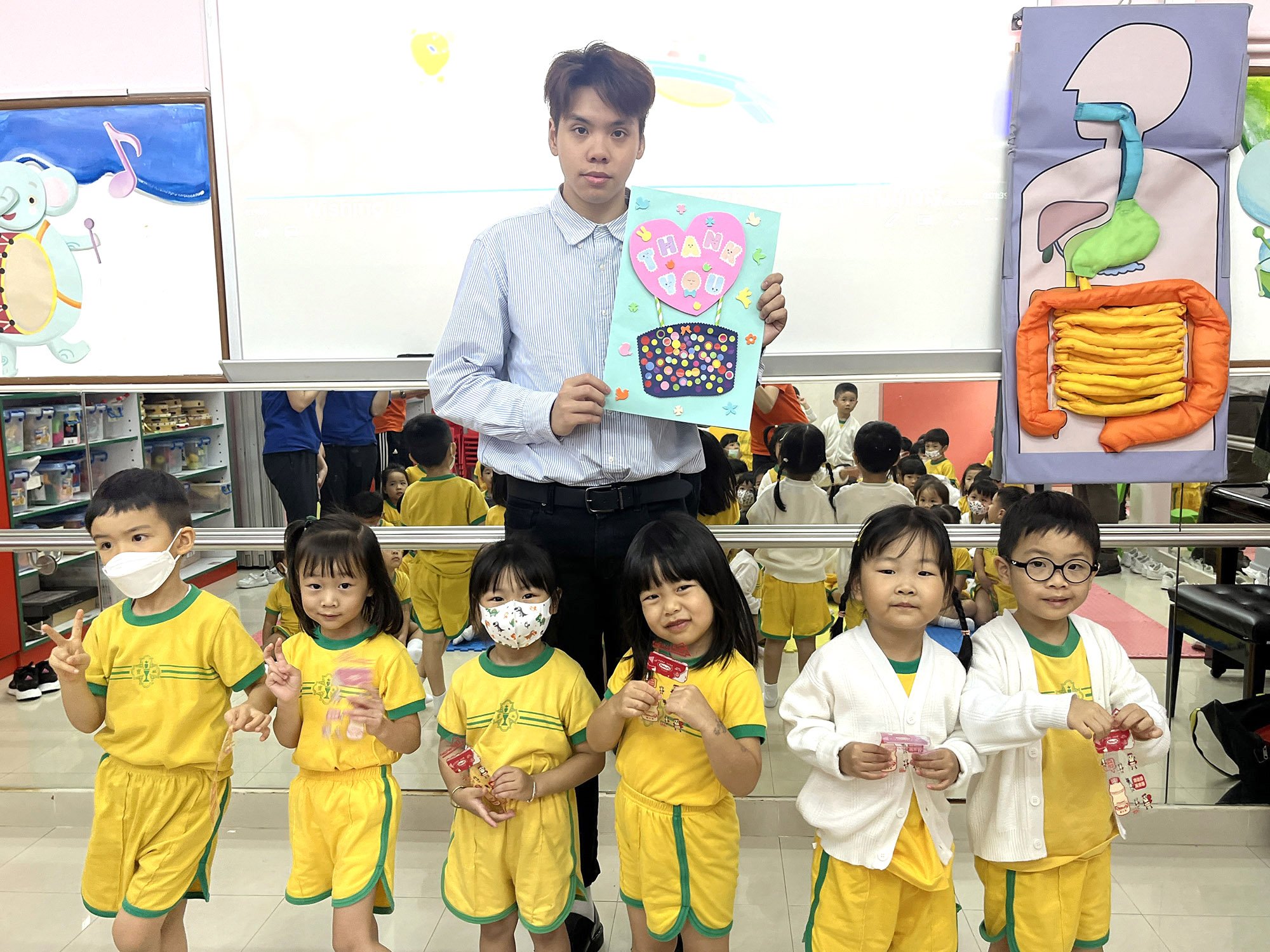 To tie in with the theme of the K1 Class, 'The Princess is Sick', we organized a 'Food Nutrition Seminar' on 29 April 2024 for the K1 Class students. The speaker firstly introduced the structure of the digestive system to the children by using a simulated human organ teaching kit. The speaker invited the children to hold a small intestine prop to introduce the functions of the intestines and the children were very surprised by the length of the small intestine, and explained the relationship between a healthy diet and bowel movement; and then, through the animation, the children were introduced to the fact that probiotics in the intestines could help to fight against the harmful bacteria and maintain intestinal health, as well as interactive quiz games. The children were engaged in learning about healthy eating and even made thank-you cards for the speaker to show their appreciation.