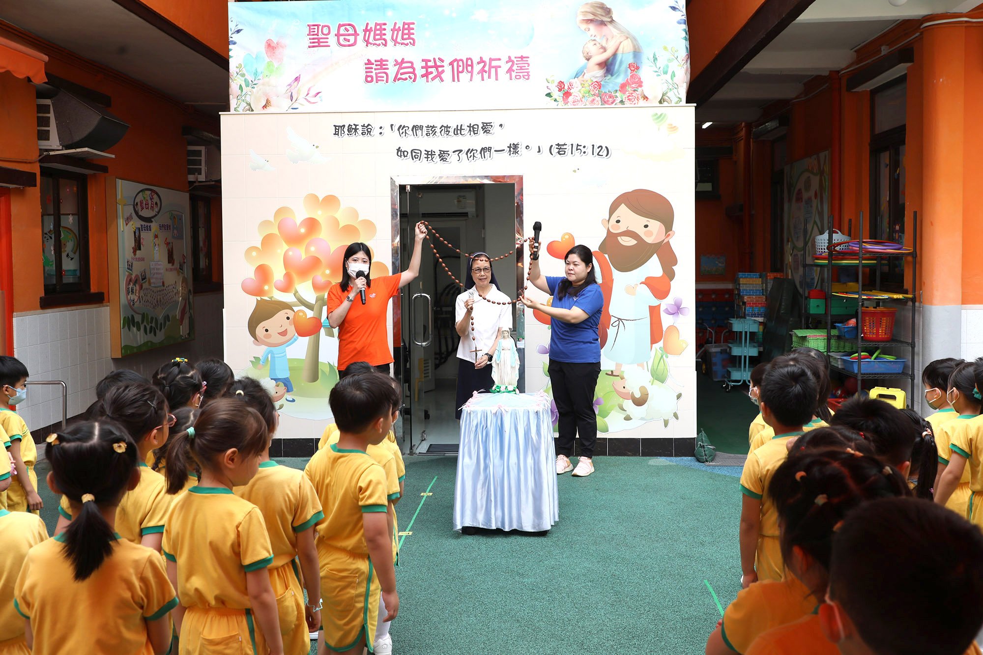 五月是教会特别敬礼圣母的日子。圣母妈妈教导我们要关心及帮助别人,常常为有需要的人祈祷。为向圣母表达敬爱之情,在活动期间,众师生接受了甘修女的祝福及派遣,同时老师向幼儿送上祝福,祝福他们健康快乐!天主爱你!幼儿也将这份祝福带到家庭,让每一个家庭平安幸福。