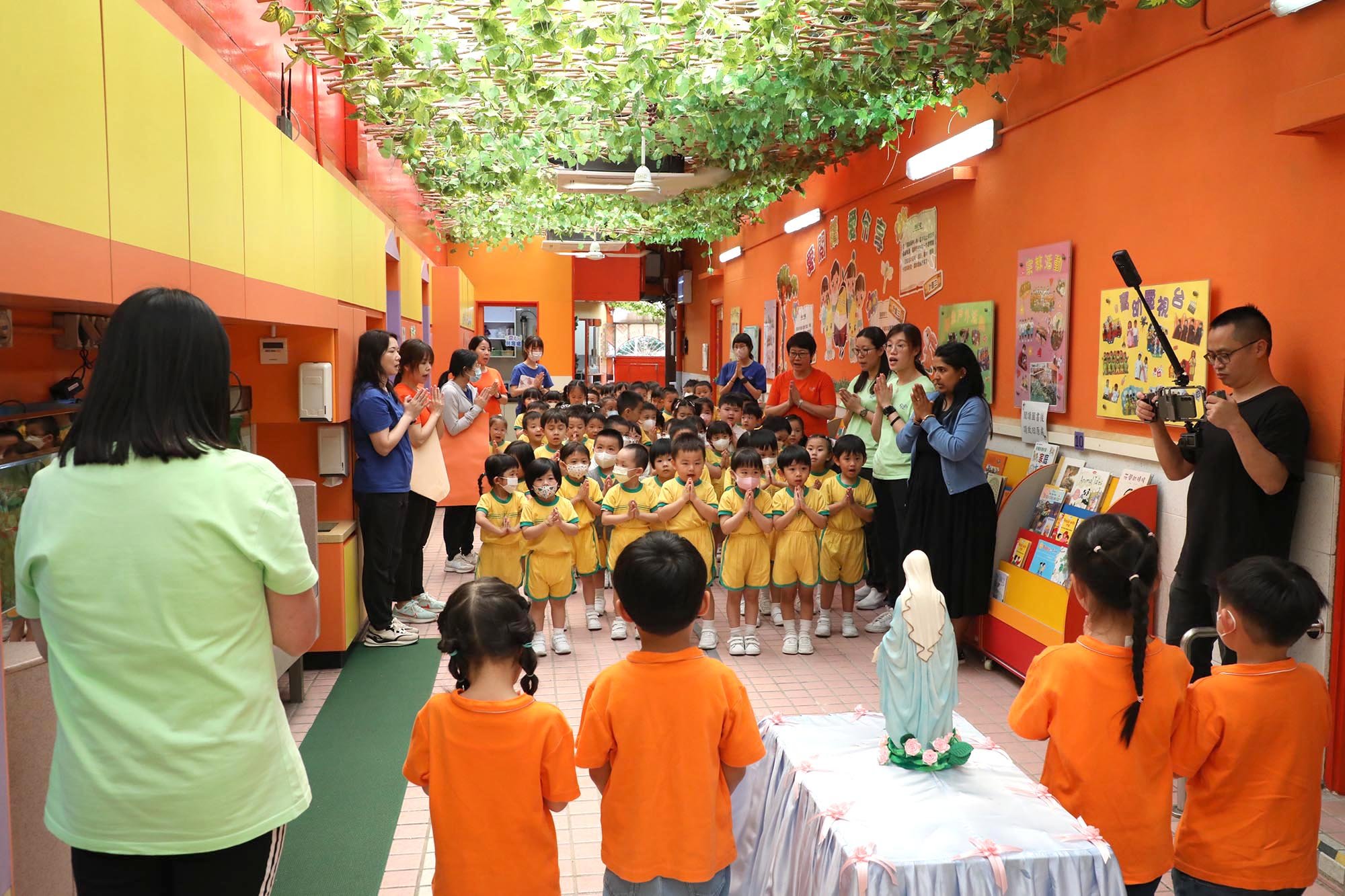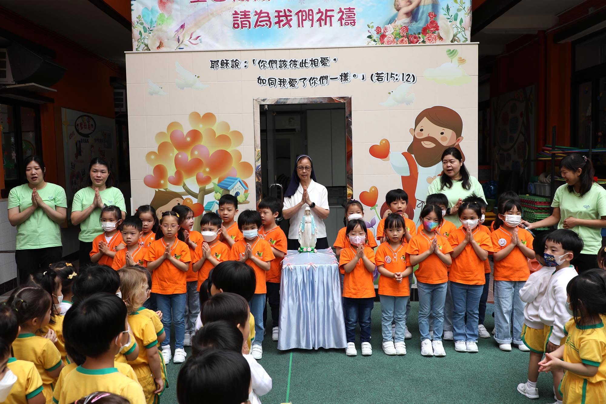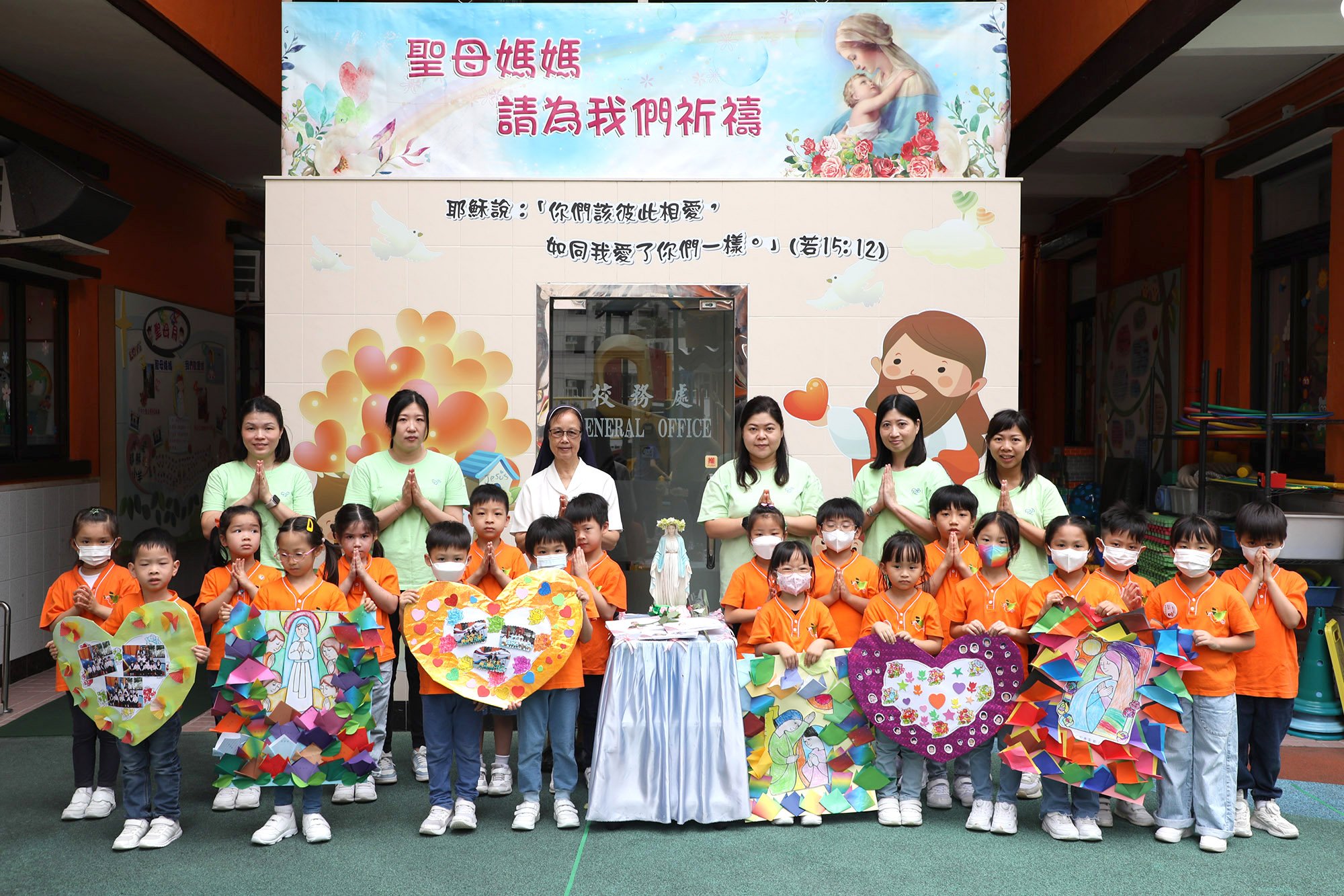On May 29 (Wednesday), our school organized a special activity for the month of Our Lady - Our Lady's Parade. Sister Gan, teachers and representatives of the Little Children of Christ escorted the statue of the Blessed Mother around the school, and all teachers and students followed the Blessed Mother's car, which was a spectacular scene. Along the way, they prayed for the children's intentions and sang "Our Lady of Fátima", "Our Lady Loves the Child in Her Heart" and "Our Lady of China" to thank and praise Our Lady. After the parade, representatives from each class presented flowers and the children gave hearts and kisses to express their love and devotion to Our Lady.