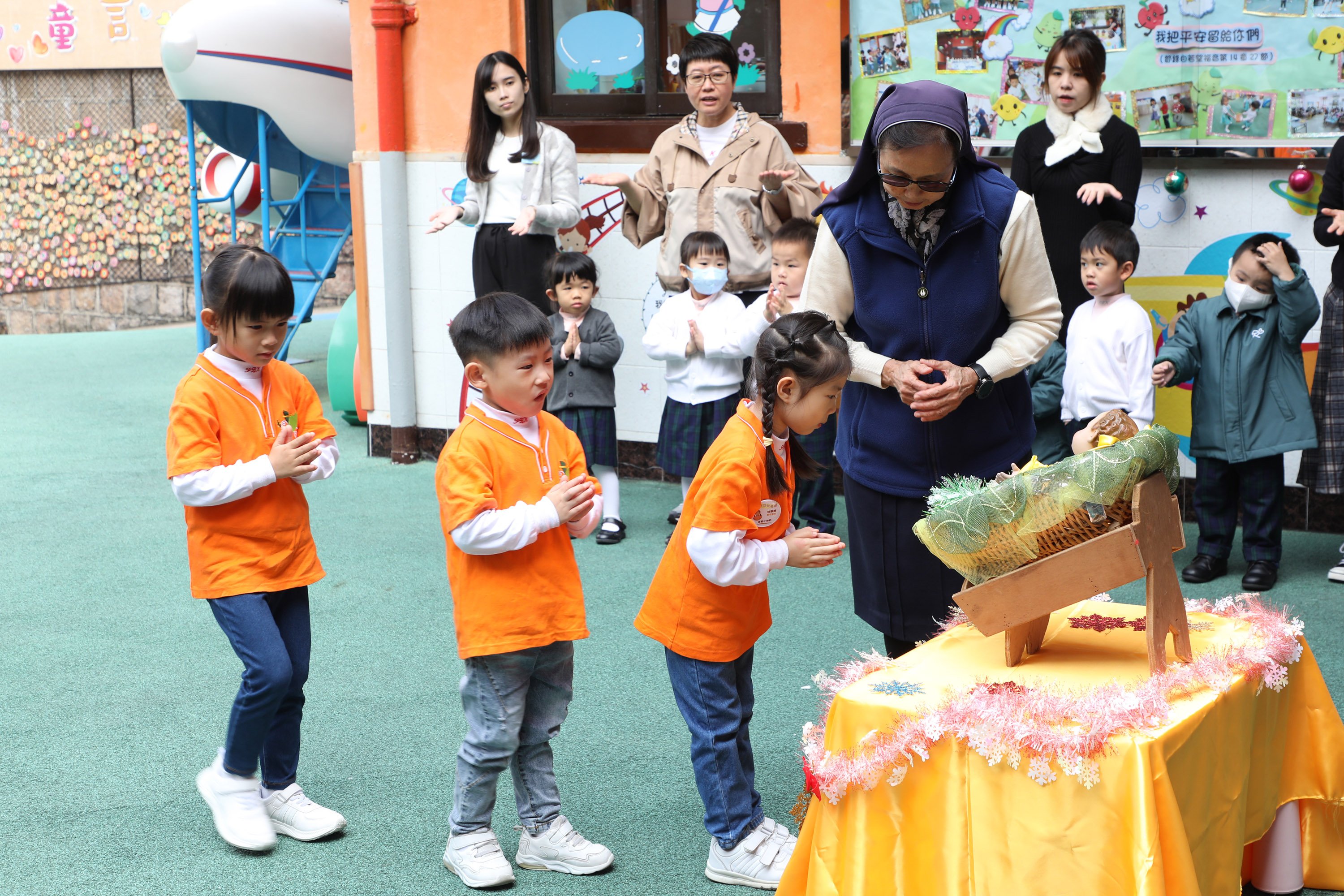 2023년 12월 19일에는 아기 예수의 탄생을 축하하는 성탄 기도 모임도 열었습니다. 이날 전교생이 운동장에 모여 함께 기도한 후 캄 수녀님이 성모상과 그리스도의 작은 묘목을 들고 운동장을 행진한 후 캄 수녀님이 성모상을 엄숙히 봉헌하고 각 반 어린이들이 아기 예수님께 선물로 선행을 약속하는 시간을 가졌습니다.