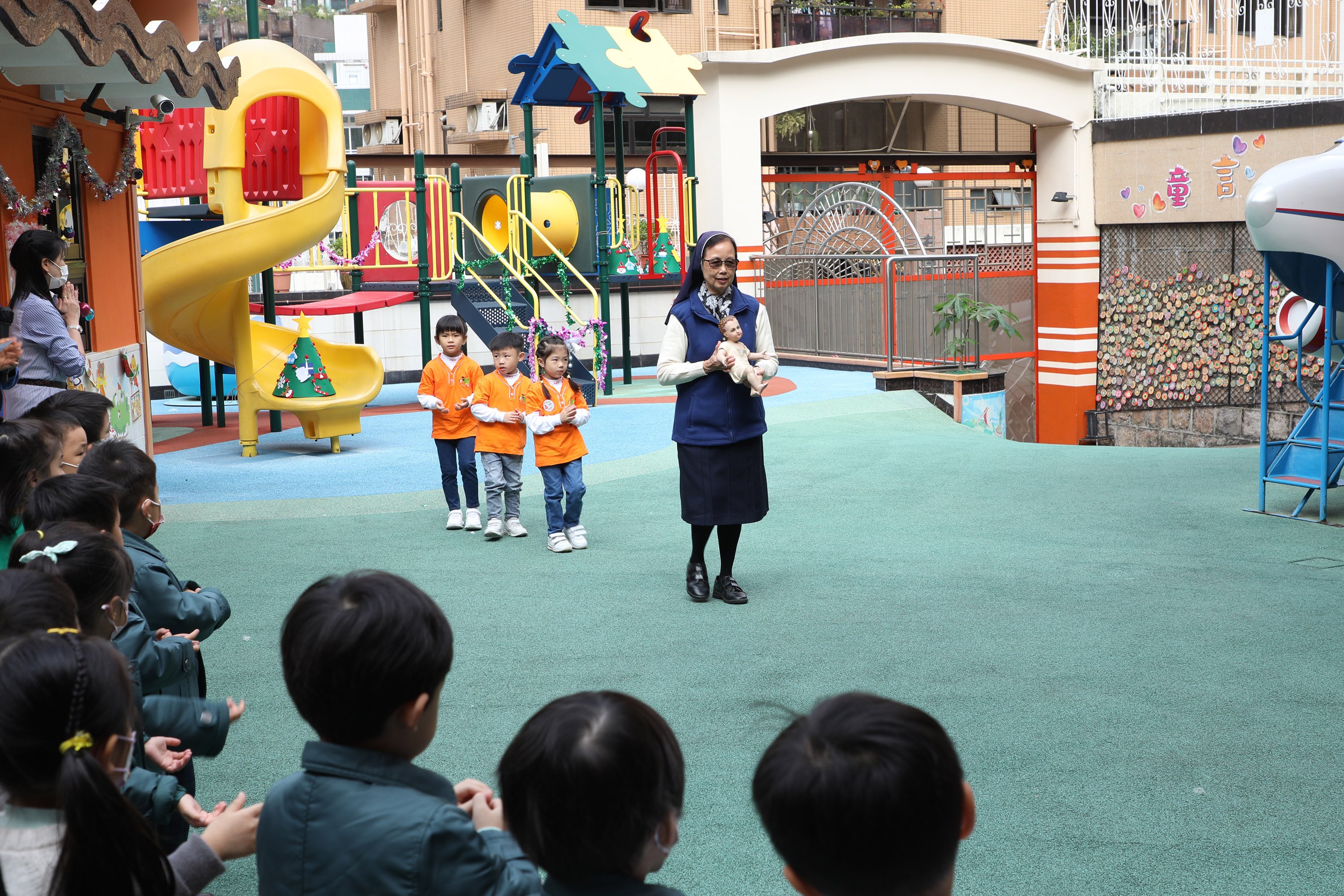 2023年12月19日我们亦在学校举行「圣诞感恩祈祷会」,庆祝小耶稣的诞生,当天全校师生齐集操场一起祈祷,然后甘修女抱着圣婴与基督小幼苗在操场中巡游一周,随后甘修女隆重地献上圣婴,每班小朋友说出一个好行为的承诺作为献给小耶稣的礼物。
